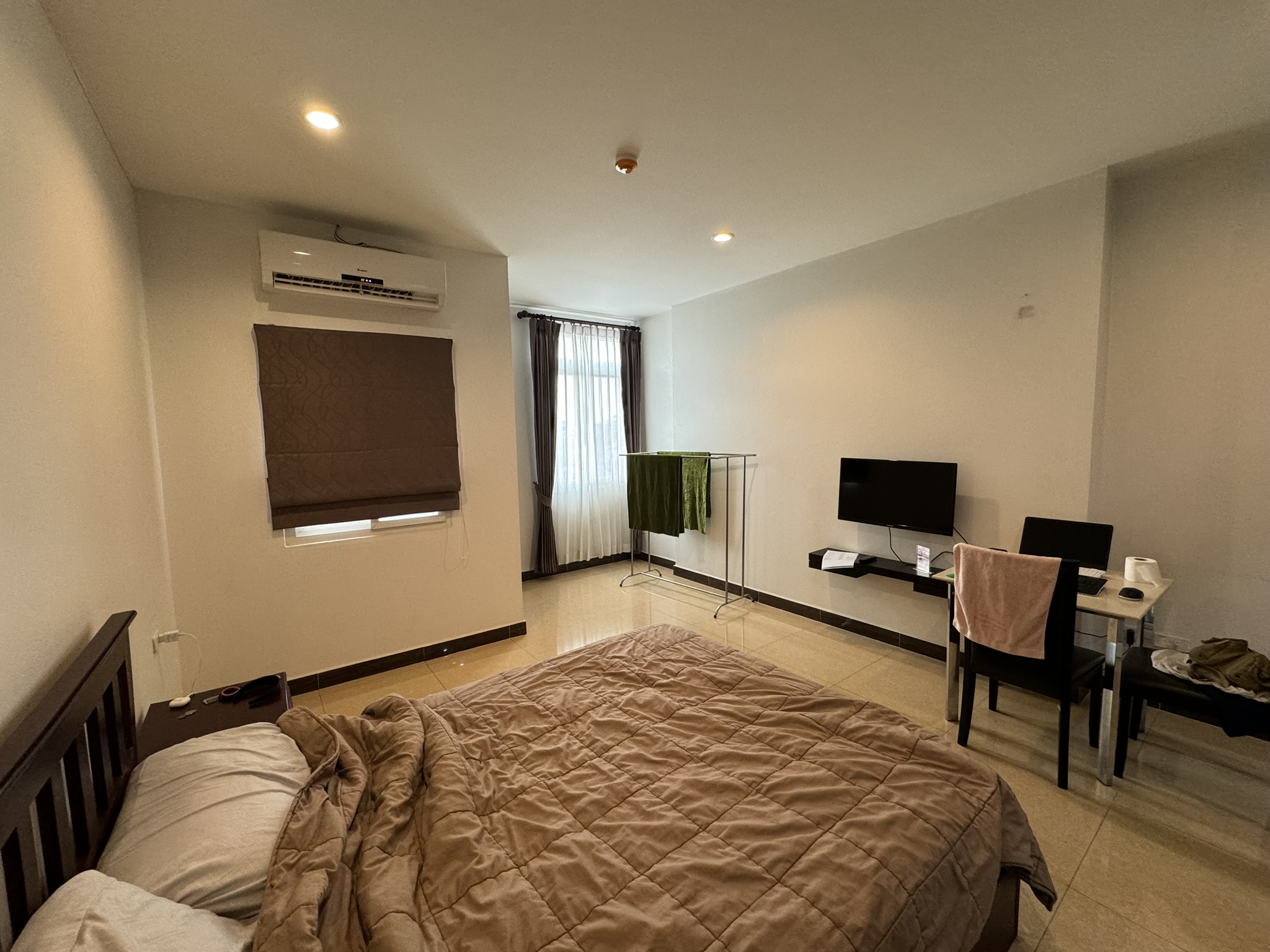 깔끔한 원룸 구조의 방이다. 티브이보단 아무래도 유튜브를 보아서 사실 티브이를 잘 켜지 않았다. 간단한 식탁과 협탁이 있고 옷장에 금고가 있다.
