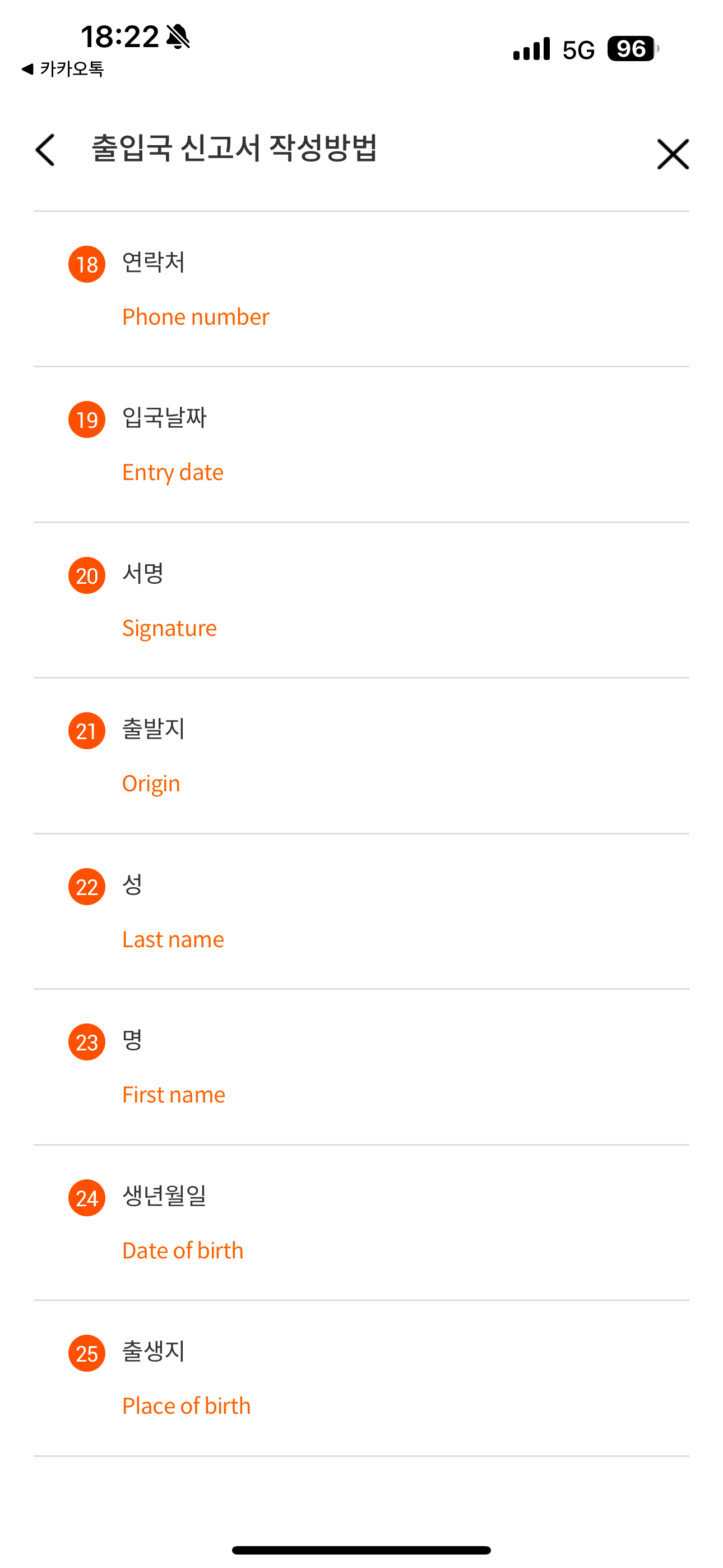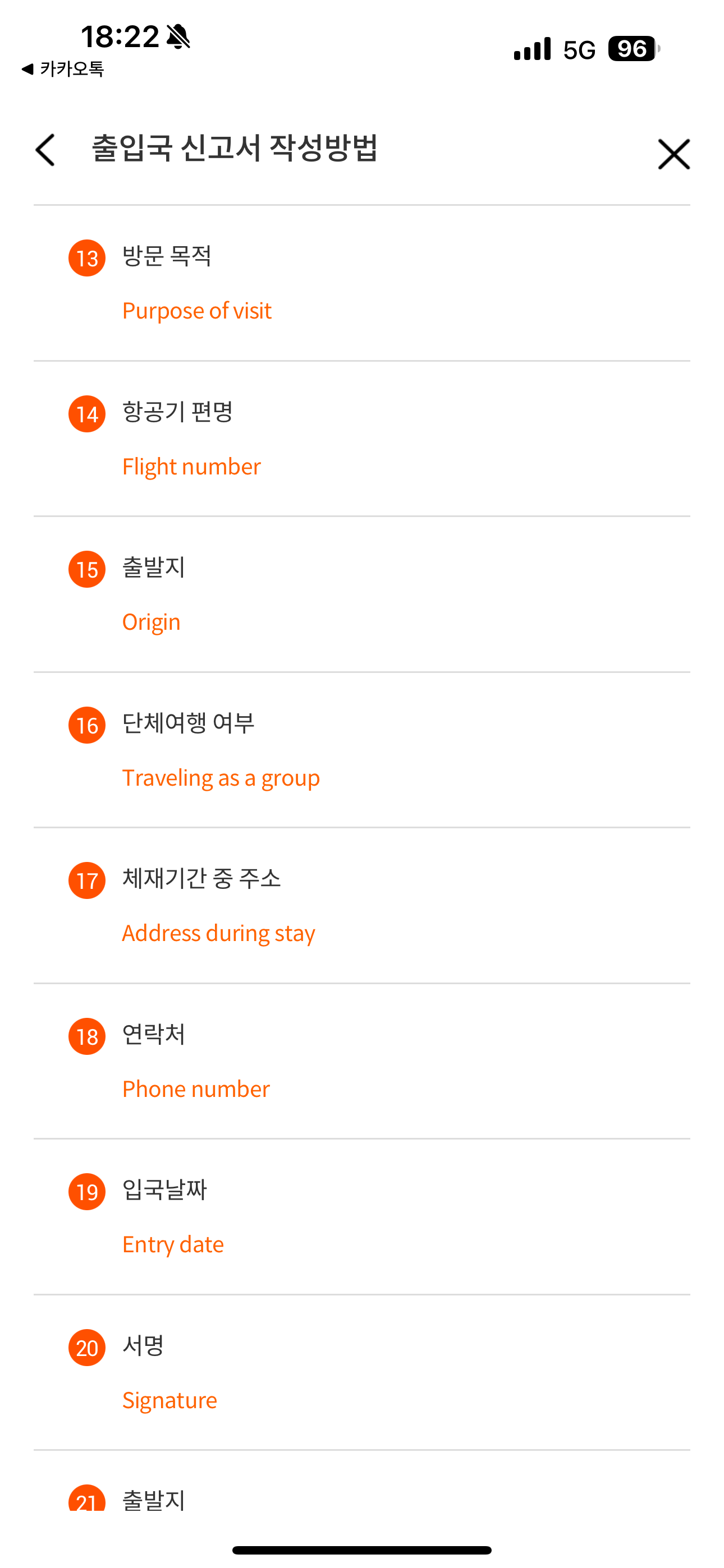 도착하기 전에 작성하는 출입국 신고서